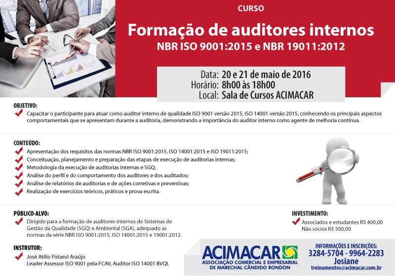 Com o tema “Formação de Auditores Internos NBR ISO 9001:2015 E NBR 19011:2012” será realizado um treinamento sobre normas em Gestão de Qualidade (SGQ) e Gestão Ambiental (SGA) nos dias 20 e 21 de maio, das 08h às 18h, na sala de cursos da Associação Comercial e Empresarial de Marechal Cândido Rondon (Acimacar).