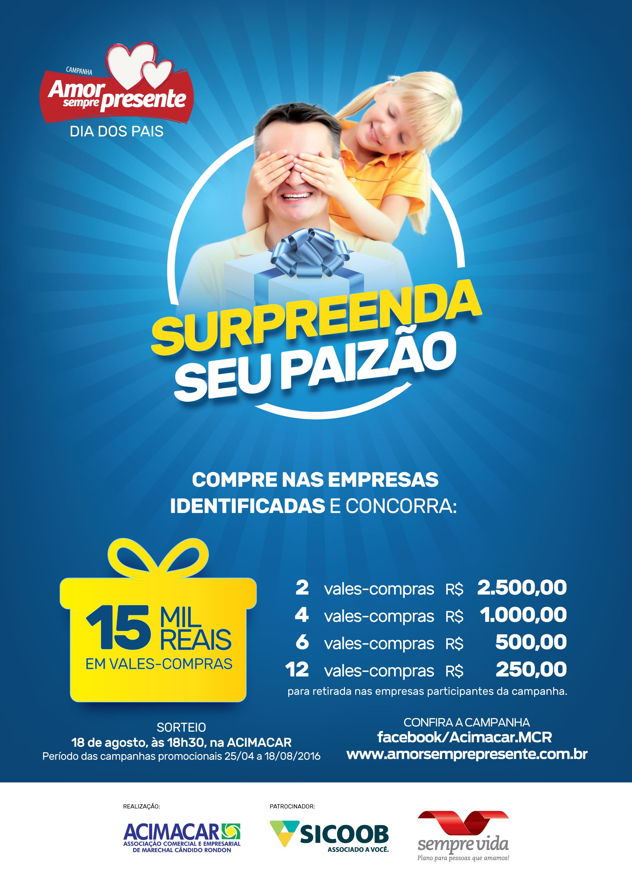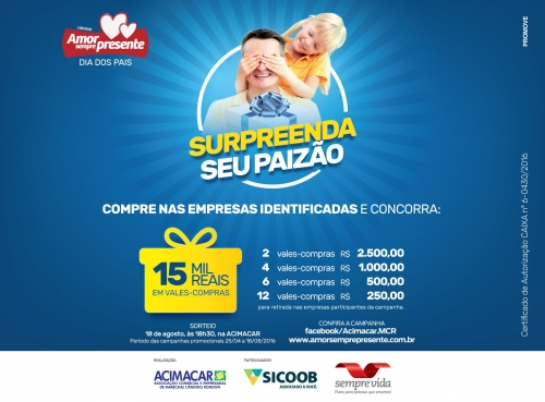 Iniciada em abril, a campanha Amor Sempre Presente continua neste mês em comemoração ao Dia dos Pais, com o slogan “Surpreenda seu paizão”. Serão sorteados RS 15 mil em vales-compras.