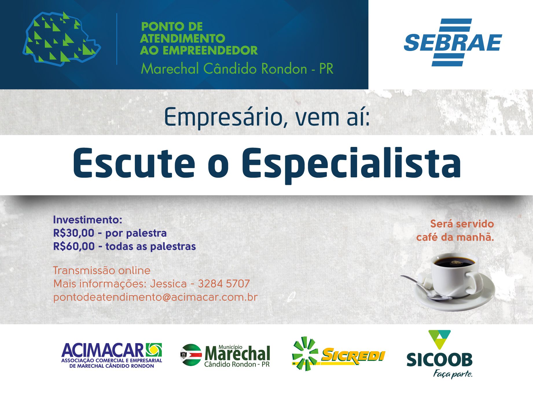 Todos os encontros terão café da manhã. O investimento para cada encontro é de R$ 30,00. Quem optar por participar das três palestras ganha desconto e paga o valor total de R$ 60,00.
