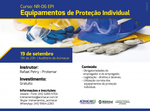 No curso Norma regulamentadora 06 – EPI, que será realizado dia 19 de setembro, das 19h às 23h, serão repassados aos colaboradores e às empresas normas referentes ao uso e obrigações para ambas as partes, além de dicas para conservação de equipamentos e o porquê de todos os cuidados.