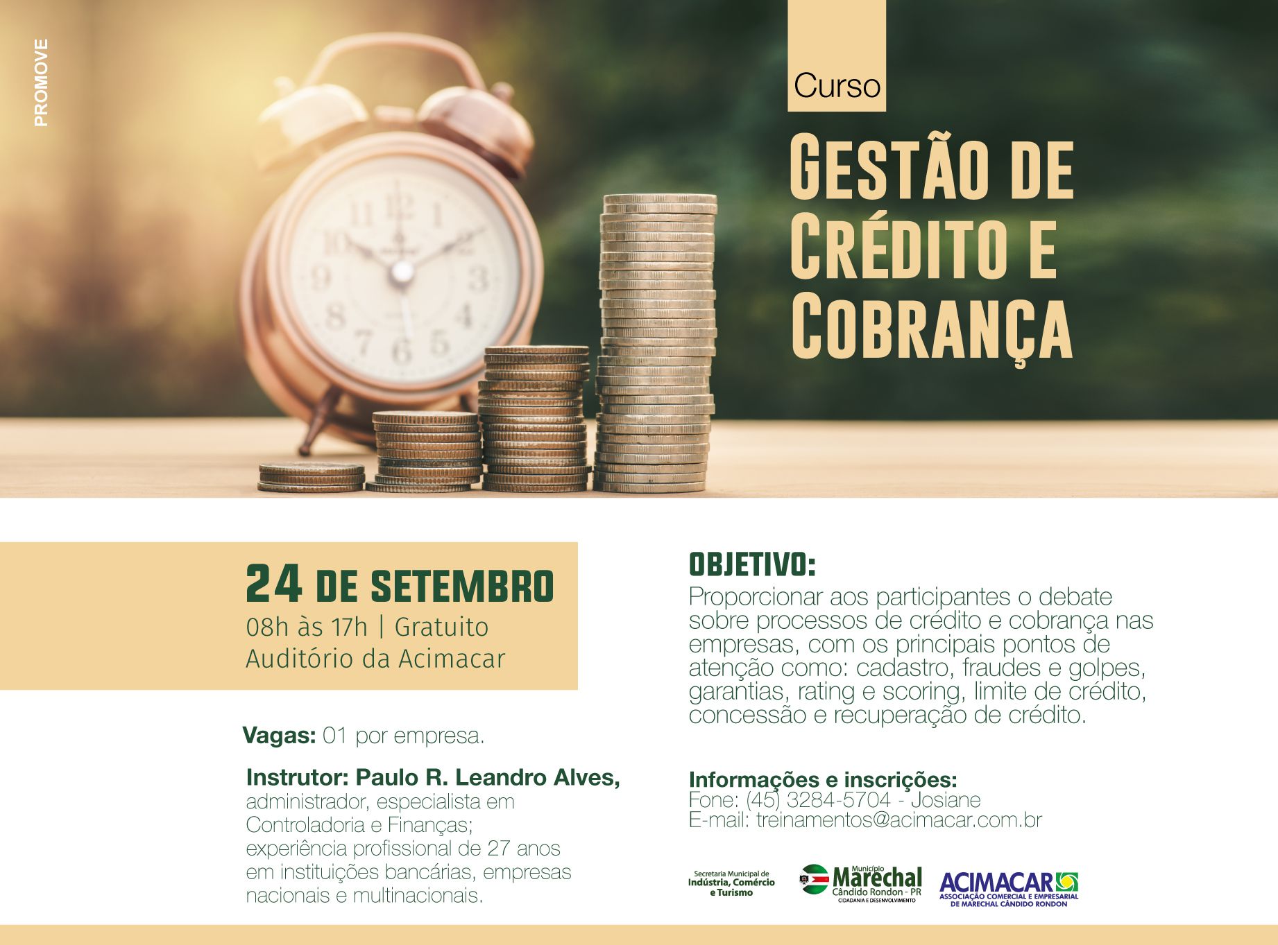 Boas práticas de gestão financeira são essenciais para encontrar o equilíbrio entre receita e risco, dentro de qualquer empresa. Para tanto, será oferecido no sábado (24) o curso ‘Gestão de Crédito e Cobrança’, das 08h às 17h, na Associação Comercial e Empresarial de Marechal Cândido Rondon (Acimacar).