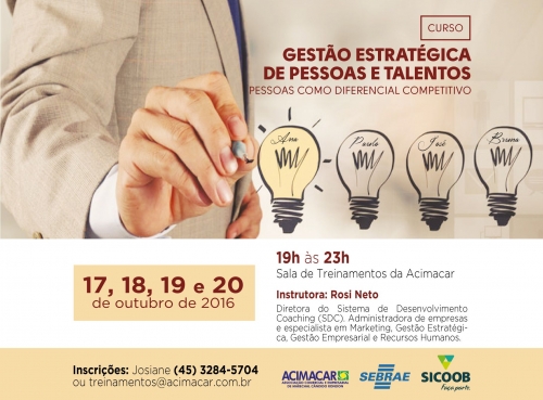 Por isso, a Associação Comercial e Empresarial de Marechal Cândido Rondon (Acimacar) disponibiliza o curso “Gestão Estratégica de Pessoas e Talentos”, que será realizado nos dias 17, 18, 19 e 20 de outubro, na sala de treinamentos da entidade.