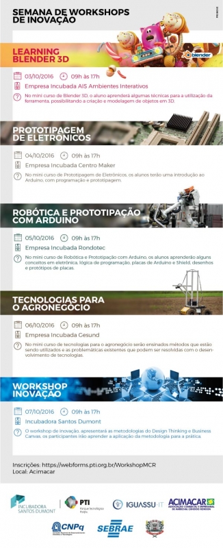 Começa hoje (03) e segue até sexta-feira (07) a 1ª Semana de Workshops de Inovação, na sede da Associação Comercial e Empresarial de Marechal Cândido Rondon (Acimacar). Serão cinco workshops, envolvendo as temáticas de tecnologia da informação e comunicação, robótica, eletrônica, tecnologias para o agronegócio, metodologias de Design Thinking e Canvas.