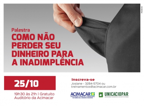 Para que o empresário rondonense esteja preparado e encontre saídas para vencer a inadimplência, acontece na próxima terça-feira (25), na Associação Comercial e Empresarial de Marechal Cândido Rondon (Acimacar), a palestra gratuita ‘Como não perder seu dinheiro para a inadimplência - Desenvolvendo habilidades na recuperação de crédito’, no auditório da entidade, das 19h30 às 21h.
