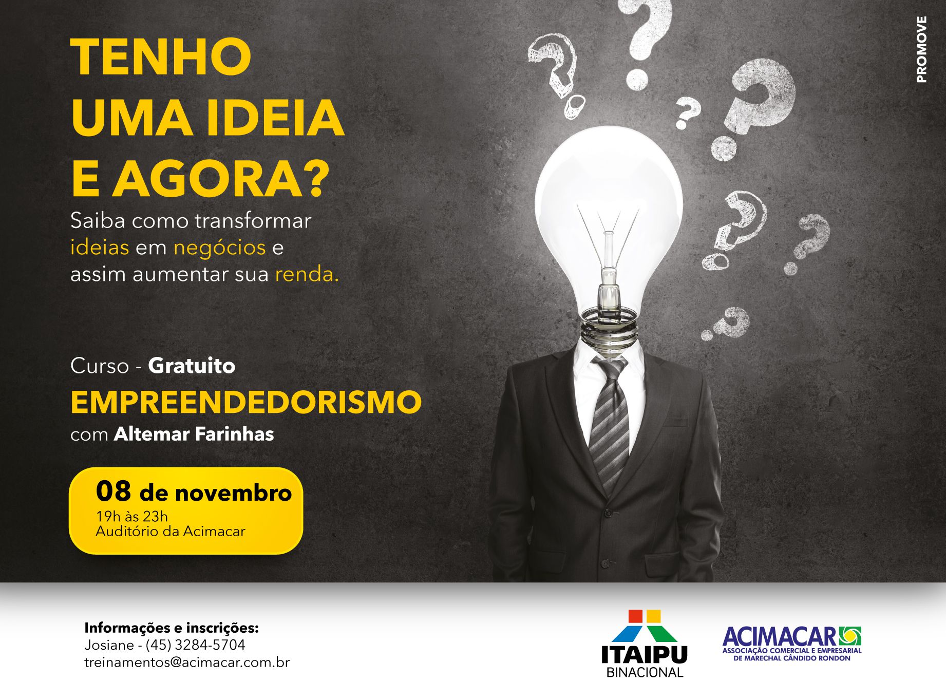 Com a palestra “Empreendedorismo”, o palestrante e administrador de empresas Altemir Farinhas estará novamente na cidade na próxima terça-feira (08), por meio do Ciclo de Palestras, promovido pela Associação Comercial e Empresarial de Marechal Cândido Rondon (Acimacar) em parceria com a Itaipu Binacional.