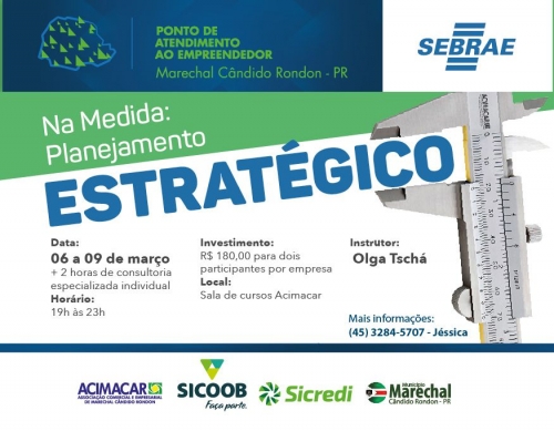 De 06 a 09 de março, o Programa Na Medida 2017 inicia com o tema Planejamento Estratégico, oferecido Pelo Ponto de Atendimento ao Empreendedor do Sebrae, na Associação Comercial e Empresarial de Marechal Cândido Rondon (Acimacar).