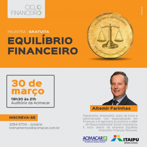 Segundo o empresário, administrador e palestrante, Altemir Farinhas, é preciso algumas estratégias e conhecimento próprio para entender como lidar melhor com as finanças. Desta forma, a Associação Comercial e Empresarial de Marechal Cândido Rondon (Acimacar) abre um novo Ciclo de Palestras – gratuito, em Educação Financeira, com o primeiro tema do ano: Equilíbrio Financeiro, dia 30 de março, às 19h30, no Auditório da entidade.