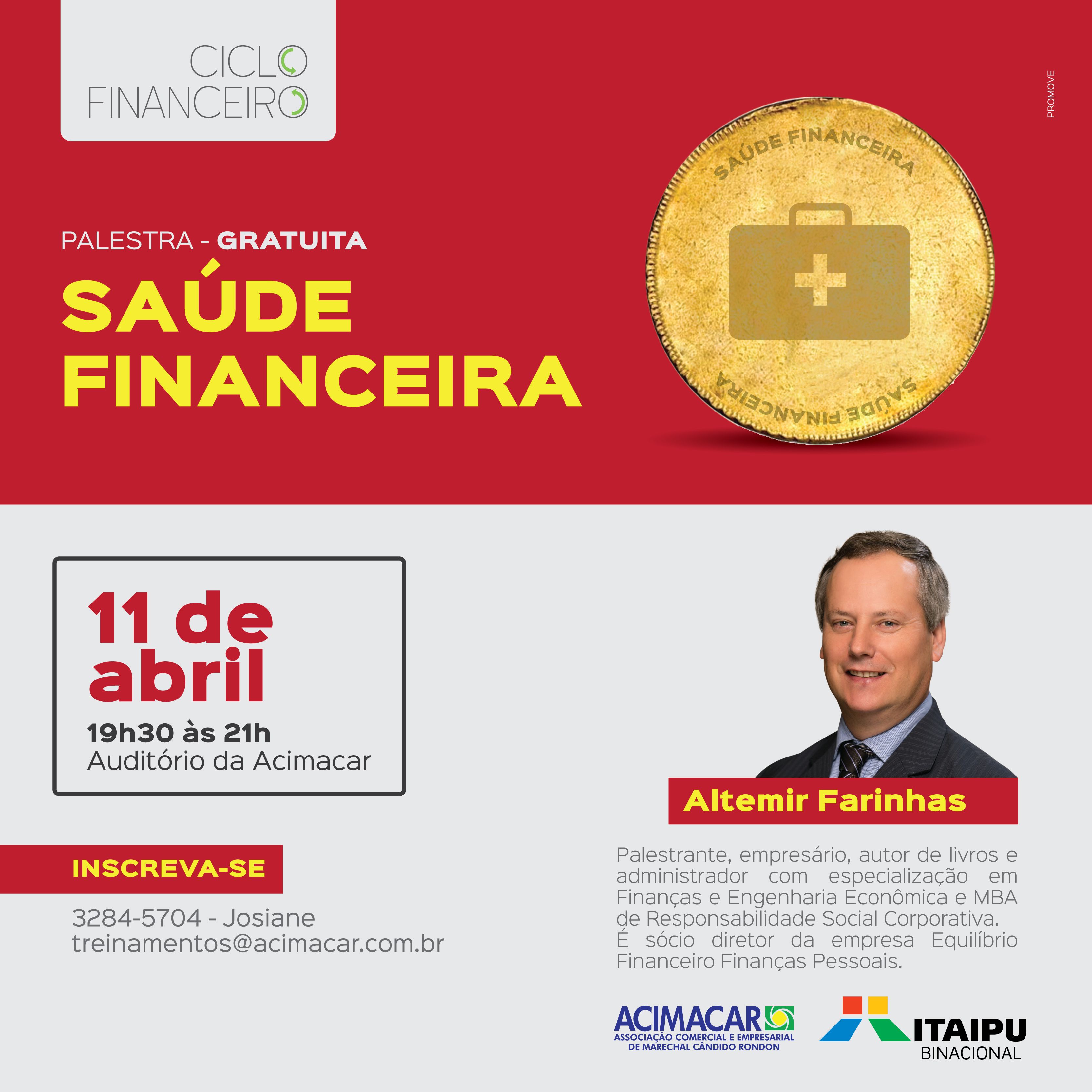 Para tratar sobre o assunto em finanças pessoais, familiares e empresariais, o especialista retorna à Marechal, no próximo dia 11, com a palestra Saúde Financeira, na Sala de Treinamentos da Associação Comercial e Empresarial de Marechal Cândido Rondon (Acimacar).