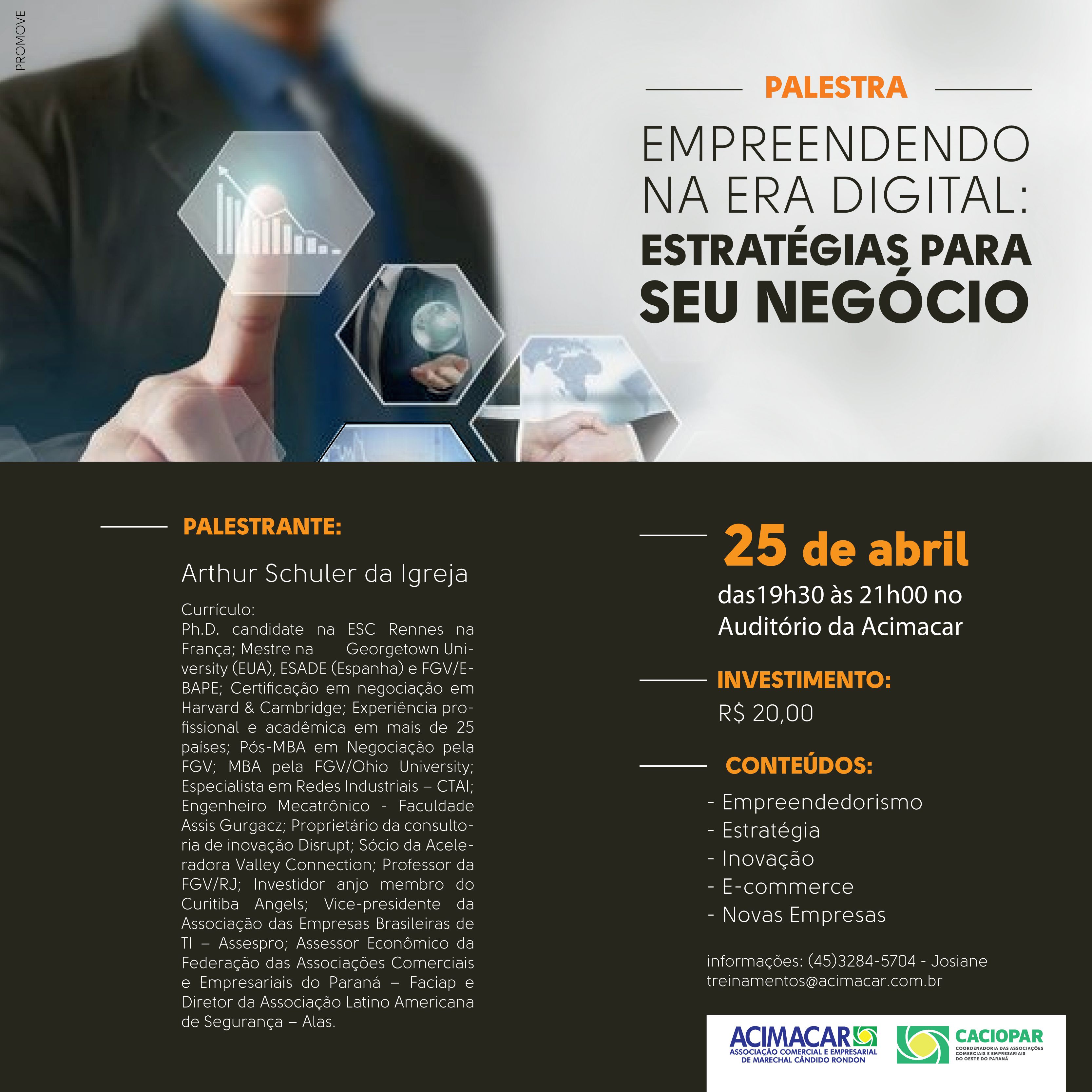 Empresário, investidor anjo, palestrante, professor da Faculdade Getúlio Vargas (FGV-RJ), com certificação em Negociação pela Universidade de Harvard (EUA) e da Universidade de Cambridge (Inglaterra), entre outras formações, Arthur Schuler da Igreja traz a palestra “Empreendendo na era digital - estratégias para o seu negócio”, na terça-feira (25), às 19h30, no Auditório da Associação Comercial e Empresarial de Marechal Cândido Rondon (Acimacar).