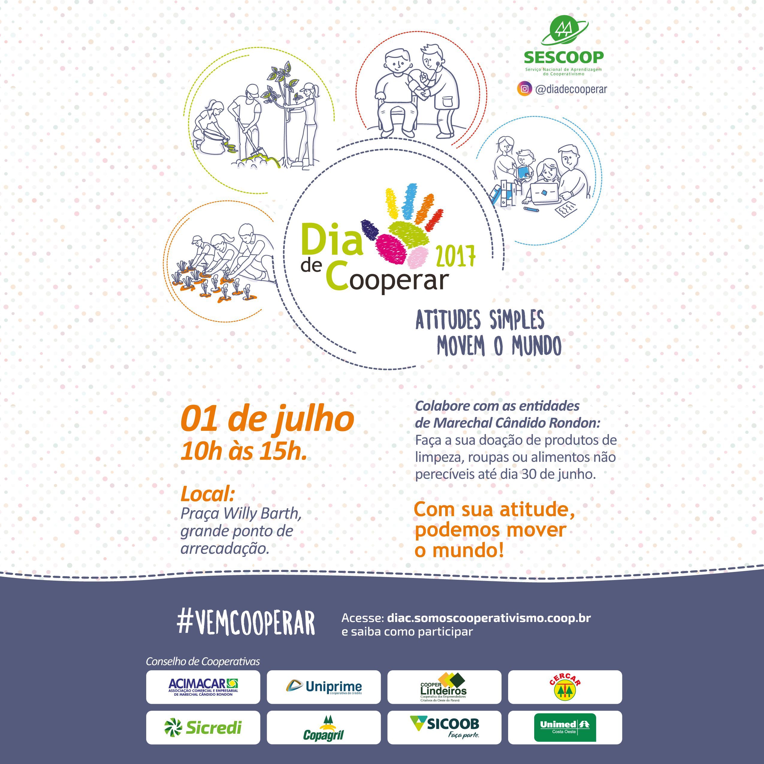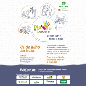 Com a missão de conectar pessoas que se dedicam ao próximo, cooperativas de todo o Brasil se unem no dia 1º de julho para comemorar o Dia de Cooperar, também conhecido como Dia C. A iniciativa da Organização das Cooperativas Brasileiras – OCB, visa promover em conjunto, ações voluntárias na busca de um mundo mais justo e igual, formando uma grande corrente do bem. Esta data coloca em prática a essência do cooperativismo, uma oportunidade de multiplicar boas ações e transformar de alguma maneira a vida das pessoas e das localidades em que as cooperativas estão inseridas.