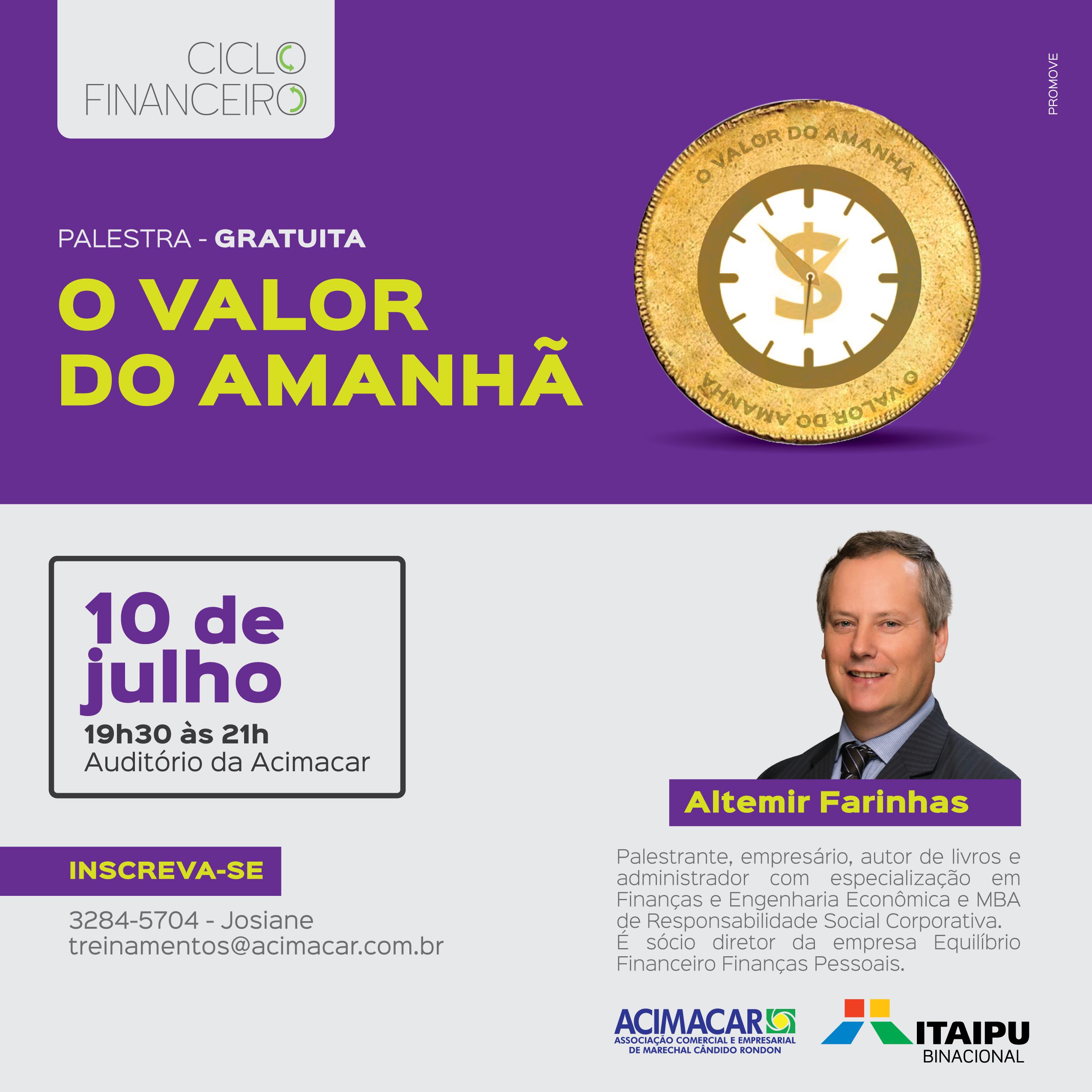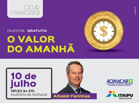 Em mais uma etapa do Ciclo Financeiro, promovido pela Associação Comercial e Empresarial de Marechal Cândido Rondon (Acimacar) em parceria com a Itaipu Binacional, será realizada a palestra ‘O Valor do Amanhã’, na segunda-feira (10), a partir de 19h30.