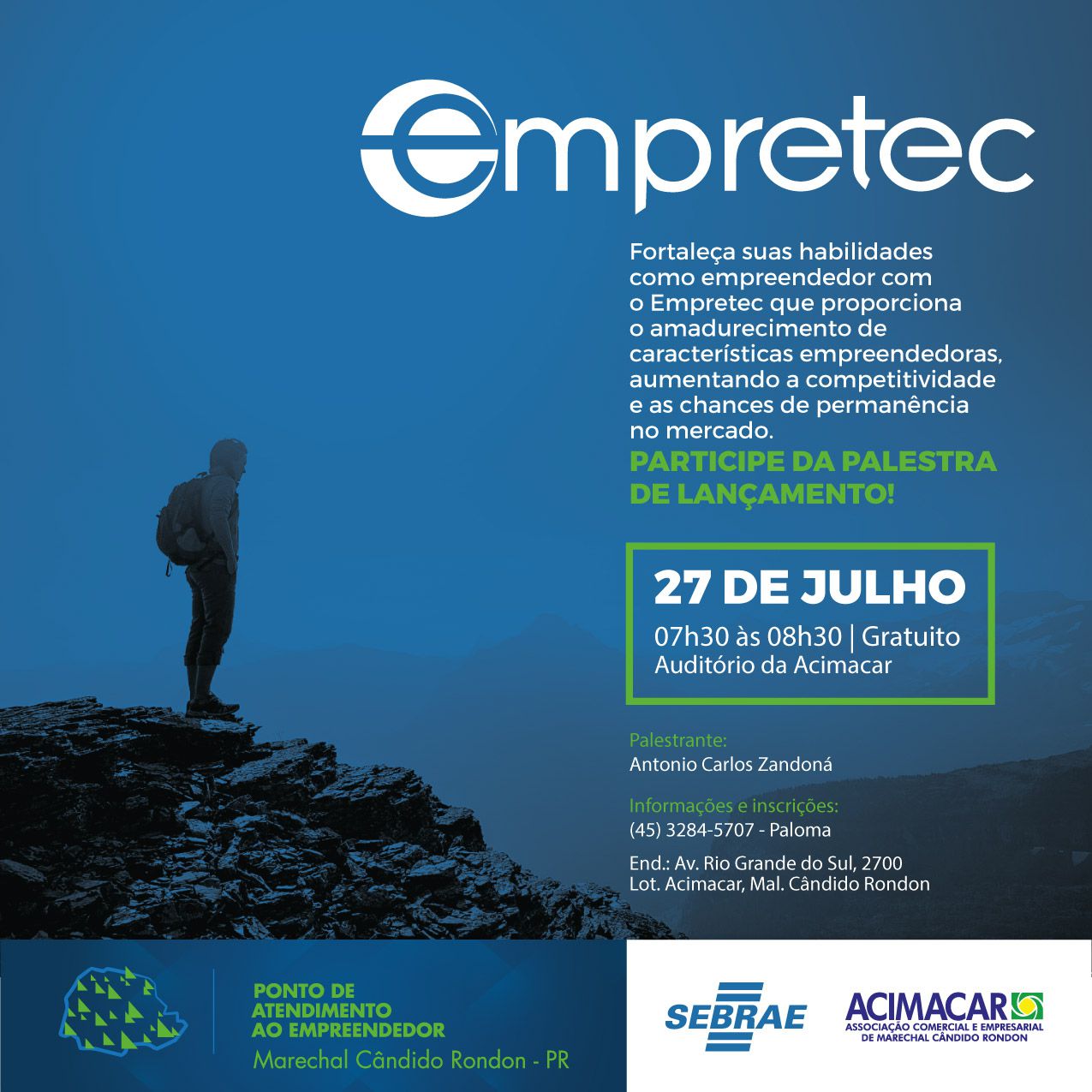 Na quinta-feira (27), a Associação Comercial e Empresarial de Marechal Cândido Rondon (Acimacar), em parceria com o Sebrae/PR, realiza a palestra gratuita de lançamento do Seminário Empretec, com Antonio Carlos Zandoná, às 07h30.