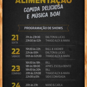 O espaço também contará com música ao vivo todos os dias priorizando artistas locais, além de duas apresentações de escolas municipais. Confira a programação: