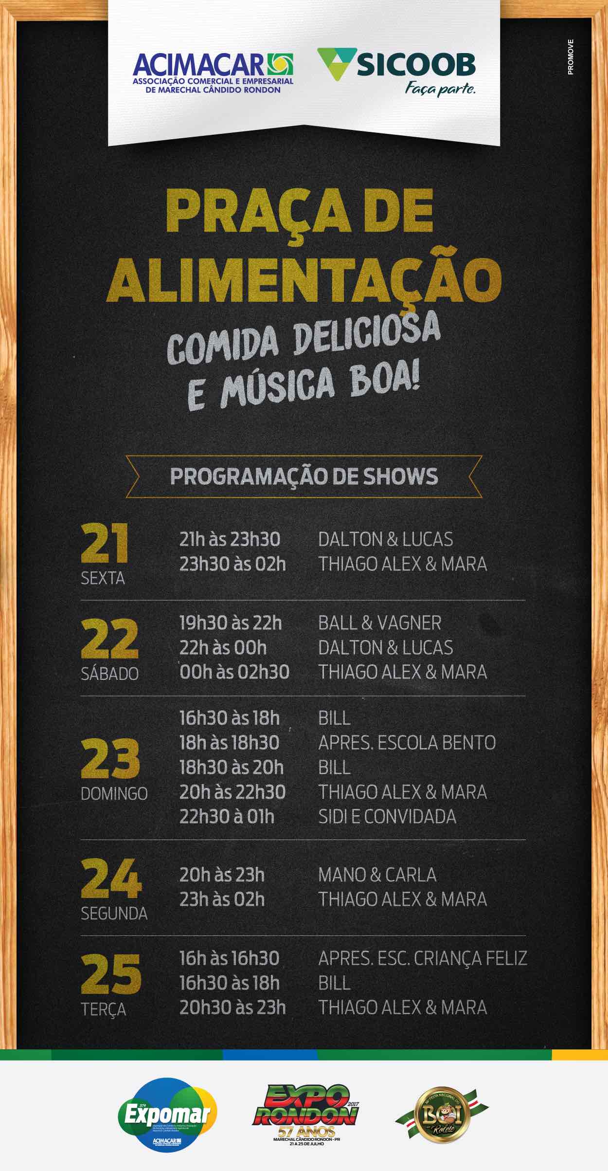 Em um novo local, com barracão coberto e piso, a Praça de Alimentação contará com 16 empresas diferentes que oferecem amplo cardápio para quem prefere deixar a refeição para outro momento. Serão espetinhos, porções, lanches, pizzas, schawarmas, crepes e doces como morango com chocolate, churros, pipoca e mais opções.
