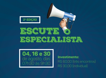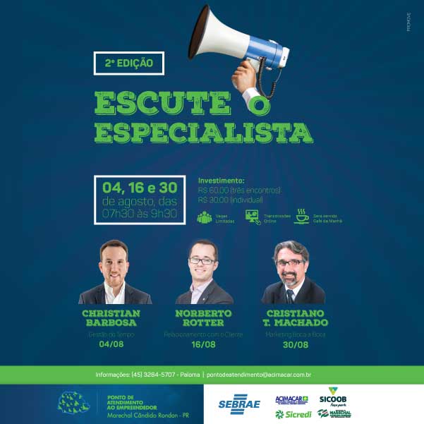 O segundo ciclo da série de encontros do Escute o Especialista ofertado pelo Ponto de Atendimento ao Empreendedor do Sebrae, na Associação Comercial e Empresarial de Marechal Cândido Rondon (Acimacar), já tem data marcada: 04,16 e 30 de agosto, das 07h30 às 09h30.