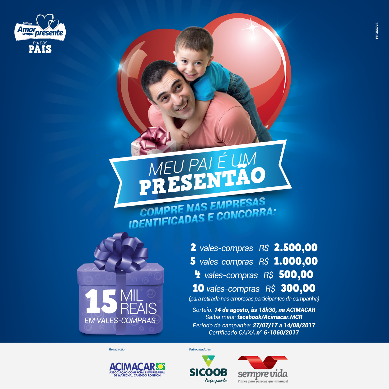 A campanha Amor Sempre Presente – Dia dos Pais é uma realização da Acimacar, em parceria com Sicoob Marechal e Sempre Vida.