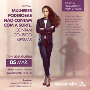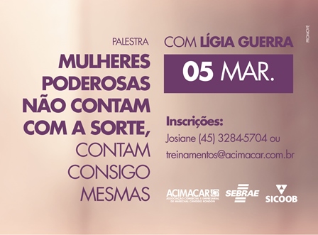 Em comemoração ao Dia Internacional da Mulher, a Associação Comercial e Empresarial de Marechal Cândido Rondon (Acimacar), em parceria com o Sebrae e Sicoob, promove a palestra ‘Mulheres poderosas não contam com a sorte, contam consigo mesmas’, que será conduzida pela psicanalista, escritora, palestrante e comentarista do programa ‘Encontro com Fátima Bernardes’ da Rede Globo, Lígia Guerra, na segunda-feira, 05 de março.