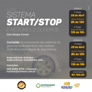 Já para o curso o sistema start/stop (tecnologia automotiva que desliga automaticamente o motor após alguns segundos da parada do veículo e volta a ligá-lo, também automaticamente quando se pretende voltar a movimentar o veículo), serão trabalhados: componentes do sistema, estratégia de controle dos sistemas, dicas de defeitos e procedimentos de diagnósticos e outros temas.
