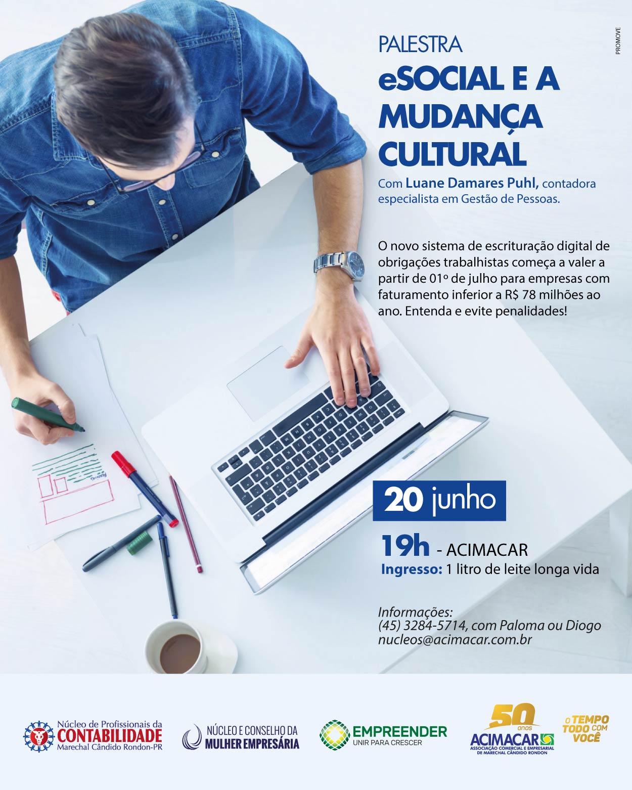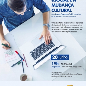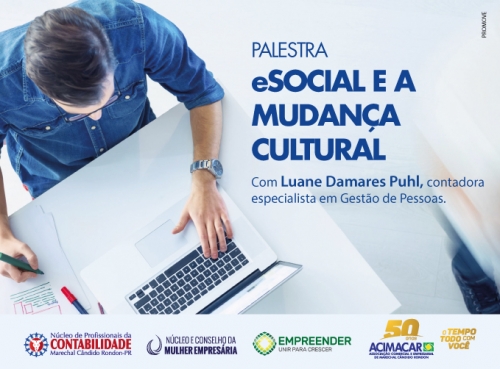 Como parte do planejamento estratégico traçado em maio, o Núcleo e Conselho da Mulher Empresária (NCME), em parceria com o Núcleo de Profissionais de Contabilidade, vinculados à Associação Comercial e Empresarial de Marechal Cândido Rondon (Acimacar), realiza a palestra ‘eSocial e a mudança cultural’, na próxima semana, 20 de junho.