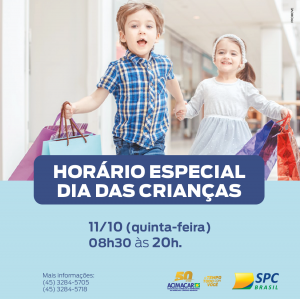Em véspera de Dia das Crianças, o comércio rondonense atende em horário especial na quinta-feira (11), das 08h30 às 20h. O horário é o mesmo praticado ano passado com a intenção de proporcionar um tempo a mais para as compras no comércio local.