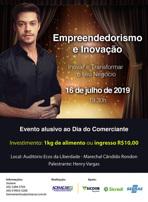 Na próxima terça-feira (16) a Associação Comercial e Empresarial de Marechal Cândido Rondon (Acimacar), com os patrocinadores Sicoob Marechal, Sicredi Aliança PR/SP e Sebrae PR, realizará uma noite mágica com a palestra: Empreendedorismo e Inovação. O evento será promovido em alusão ao Dia do Comerciante.