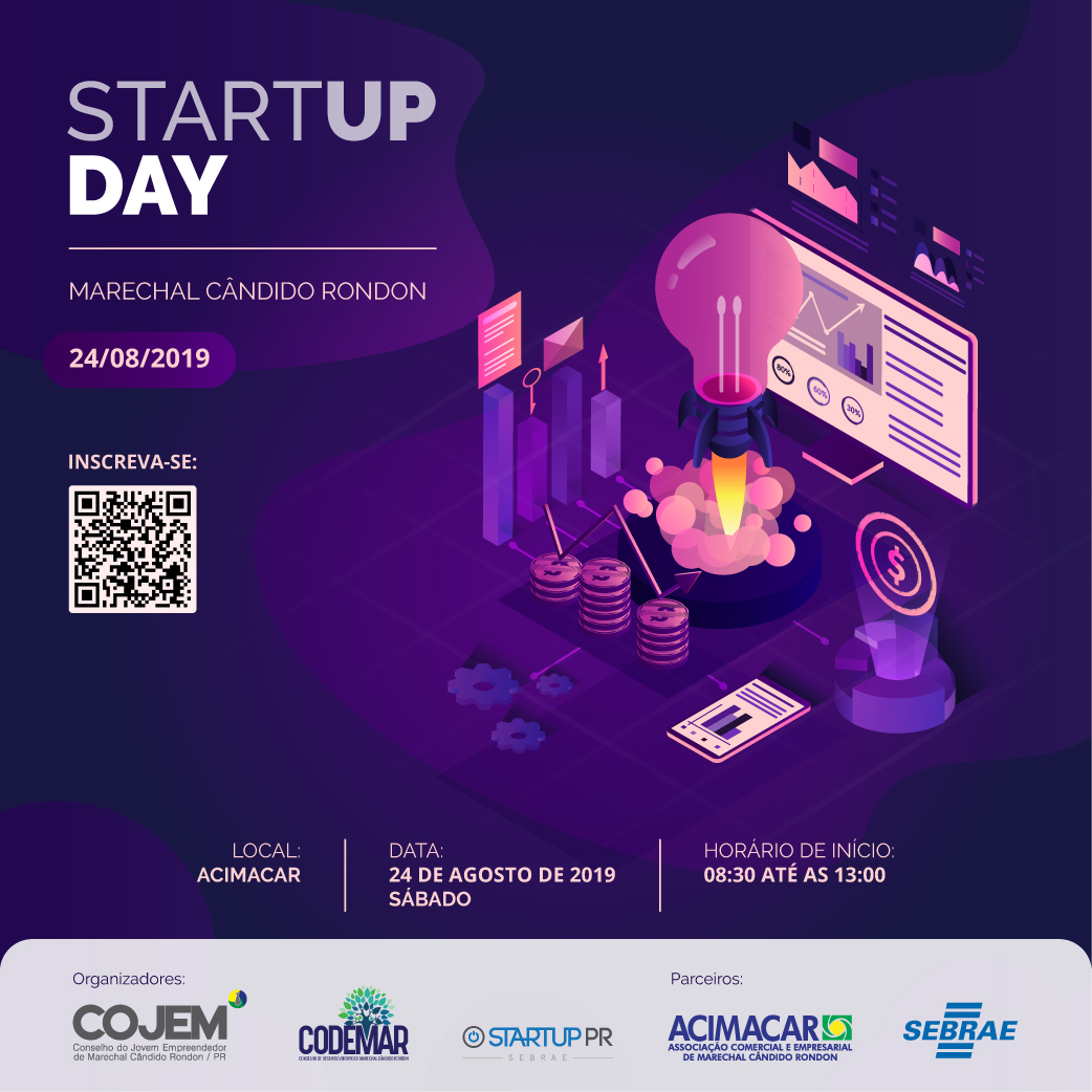 O Conselho do Jovem Empreendedor de Marechal Cândido Rondon (Cojem), ligado a Associação Comercial e Empresarial (Acimacar), em parceria a Câmara Técnica de Inovação do Conselho de Desenvolvimento Econômico e Social de Marechal Cândido Rondon (Codemar) promove, no dia 24 de agosto, o 1º Startup Day no município: um dia de conhecimento, colaboração e negócios para startups.