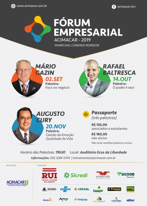 O Fórum Empresarial é uma realização da Acimacar, com patrocínio do Colégio Luterano Rui Barbosa, Sicredi Aliança PR/SP, Sicoob Marechal, Sempre Vida, Copagril, Cresol, Sebrae/PR, Sooro, CooperCard, Jornal O Presente, Activa Corretora de Imóveis, Alibra Ingredientes, Credivel, Garantioeste, Toledonet e Uniprime.