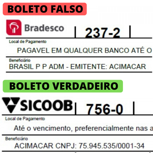 A Acimacar alerta seus associados que os boletos encaminhados pela entidade são emitidos apenas pela cooperativa de crédito SICOOB, com as seguintes informações no campo “beneficiário”: ACIMACAR CNPJ 75.945.535/0001-34.