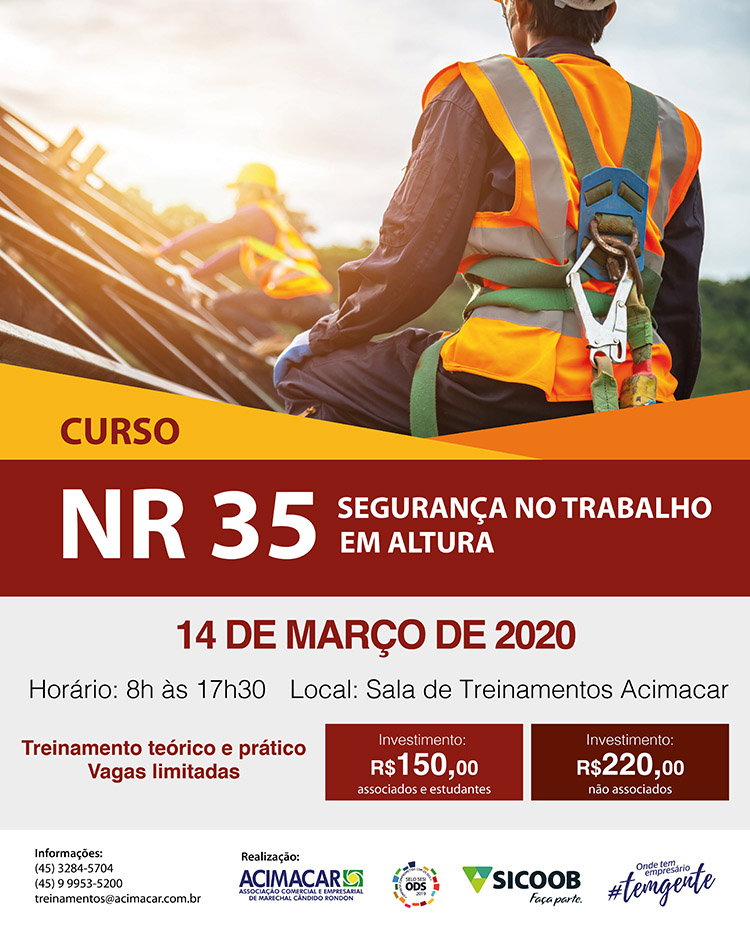A Associação Comercial e Empresarial de Marechal Cândido Rondon (Acimacar) promove, no sábado, dia 14 de março, o curso “NR 35 – Segurança no Trabalho em Altura”.