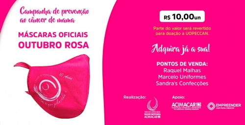 Maira salienta que as máscaras oficiais são vendidas exclusivamente pelas empresas Sandra’s Confecções, Raquel Malhas e Marcelo Uniformes, ao valor de R$ 10. “Somente as máscaras compradas nessas empresas terão o valor revertido a Uopeccan e, dessa forma, cumprirão os objetivos da campanha Um Toque Pela Vida de conscientizar a população sobre a importância do autoexame e do autocuidado e, ao mesmo tempo, auxiliar na manutenção da Uopeccan, hospital que tem grande importância na oferta de tratamento gratuito para diversos tipos de câncer”, conclui Maira.