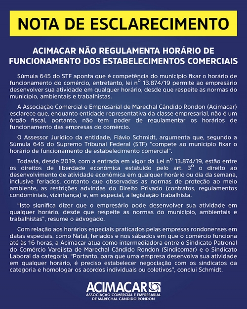 A Associação Comercial e Empresarial de Marechal Cândido Rondon (Acimacar) esclarece que, enquanto entidade representativa da classe empresarial, não é um órgão fiscal, portanto, não tem poder de regulamentar os horários de funcionamento das empresas do comércio.