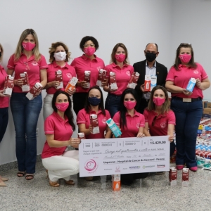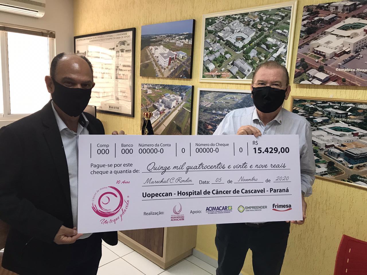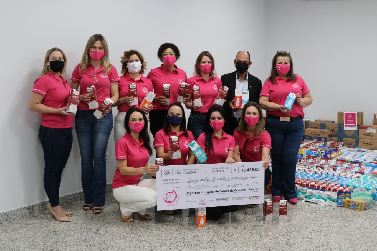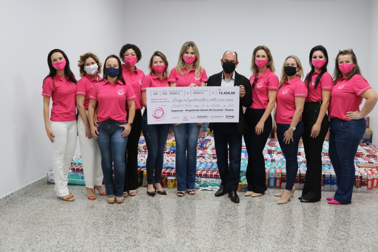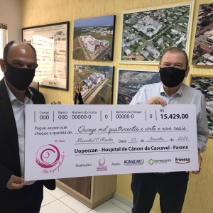 Foram repassados ao Hospital do Câncer de Cascavel (Uopeccan) R$ 15.429 em dinheiro, oriundo da venda de 2.762 máscaras e 122 camisetas, bem como de doações recebidas durante a Live do Bem, realizada no dia 23 de outubro.