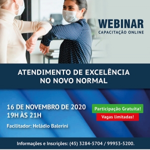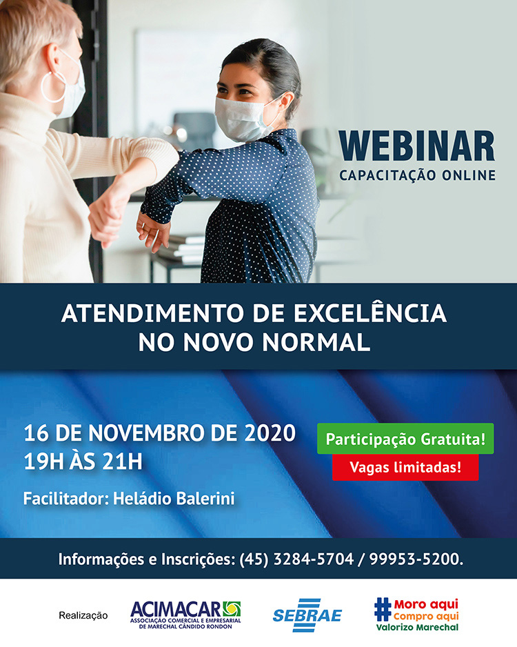 O webinar “Atendimento de Excelência no Novo Normal”, promovido pela Associação Comercial e Empresarial de Marechal Cândido Rondon (Acimacar), tem nova data de realização: dia 16 de novembro, segunda-feira.