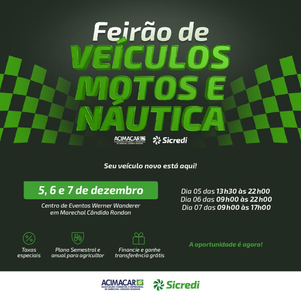 O tradicional Feirão de Veículos Acimacar/Sicredi chega à sua 31ª edição e será realizado nos dias 05, 06 e 07 de dezembro, no Centro de Eventos Werner Wanderer, em Marechal Cândido Rondon. O evento reúne empresas do setor de vendas de automóveis, motocicletas e linha náutica e oferece aos consumidores condições especiais para compra ou troca de automóveis, motocicletas e embarcações.
